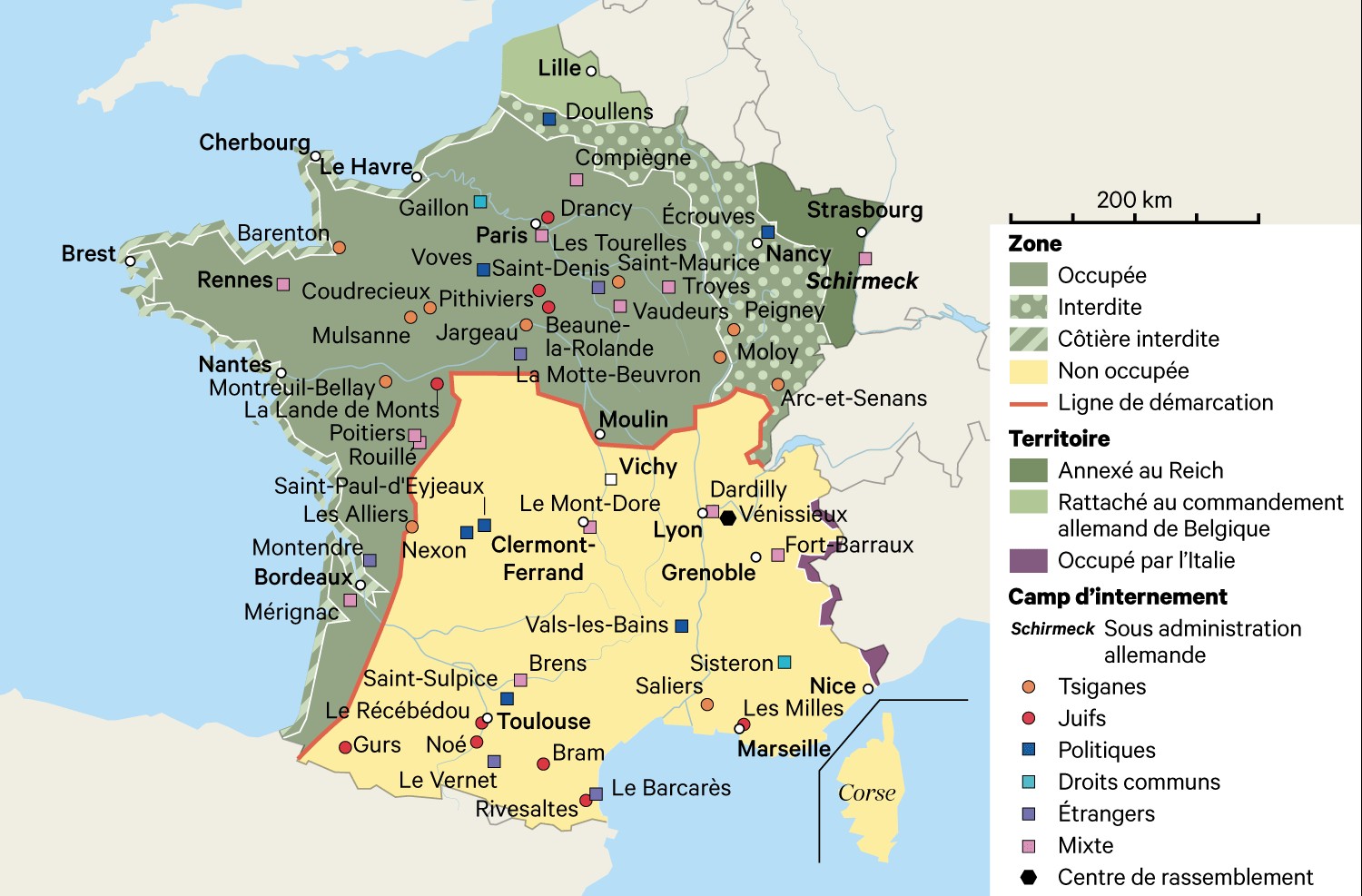 Les internements ont commencé en France avant la victoire de l'Allemagne en 1940. En 1939, le gouvernement regroupe les étrangers, les Allemands, les communistes, les républicains espagnols, dans des camps rudimentaires, souvent prévus au départ pour accueillir de futurs prisonniers de guerre, qui, de facto, seront moins nombreux qu'attendus. L'administration de Vichy organise les regroupements des Juifs allemands et français, d'opposants, d'otages au fur et à mesure de l'évolution de la situation. Elles devancent largement la demande des autorités d'occupation. Certains camps sont destinés au regroupement avant déportation. Prisons et forteresses sont vite remplies par les résistants, les Juifs et les otages. En plus de la zone libre (jusqu'en 1942), le pays est découpé en cinq zones où les conditions de vie, et d'internement, sont différentes. Du Pays basque à la frontière belge, toute la zone côtière est zone interdite. Les départements du Nord et du Pas-de-Calais dépendent du commandement allemand de Bruxelles. L'Alsace et la Moselle sont rattachés au IIIe Reich. Avant le 11 novembre 1942, le gouvernement de Vichy administre la zone libre. Après cette date, et l'occupation complète du pays, tout sera sous contrôle de l'occupant.
